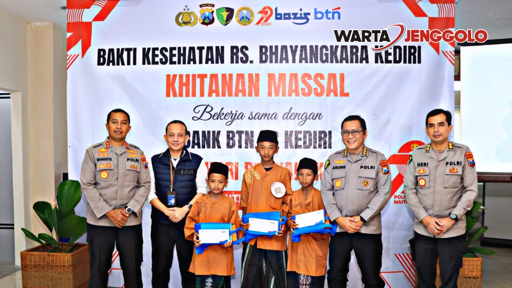 KOTA KEDIRI — Dalam rangka menyemarakkan peringatan Hari Bhayangkara ke-79, Polres Kediri Kota Polda Jawa Timur bersama Rumah Sakit (RS) Bhayangkara Tingkat II Kediri dan Bank Tabungan Negara (BTN) Kantor Cabang Kediri menggelar kegiatan Bhakti Kesehatan Khitan Massal secara gratis. Acara ini dilaksanakan pada Sabtu (28/6/2025) di Hall Bank BTN Jalan Diponegoro, Kota Kediri.