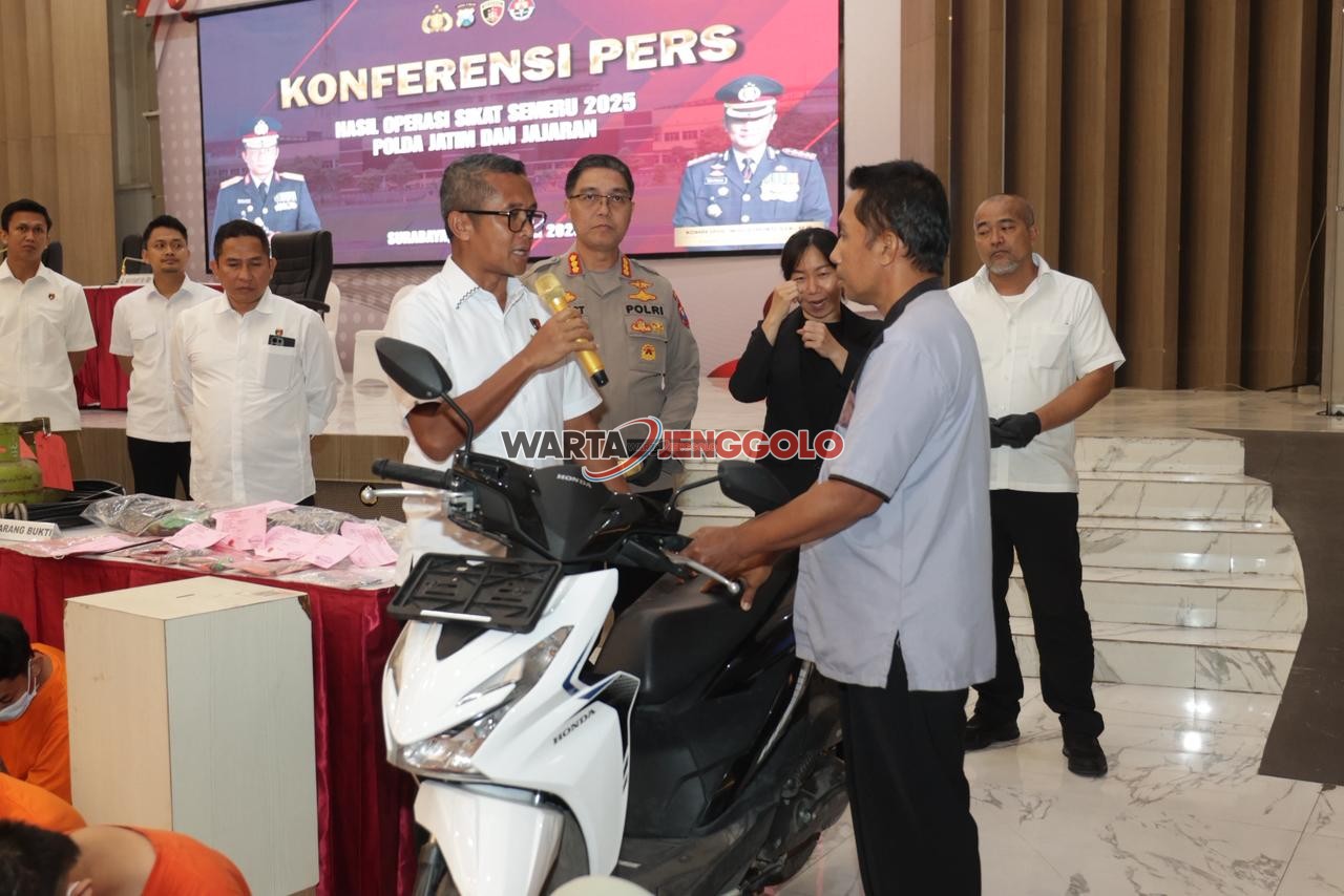 SURABAYA – Direktorat Reserse Kriminal Umum (Ditreskrimum) Polda Jawa Timur menyerahkan kembali satu unit sepeda motor Honda Beat hasil pengungkapan kasus pencurian kendaraan bermotor kepada pemiliknya. Penyerahan ini merupakan bagian dari hasil pelaksanaan Operasi Sikat Semeru 2025 yang digelar serentak di seluruh wilayah Jawa Timur.