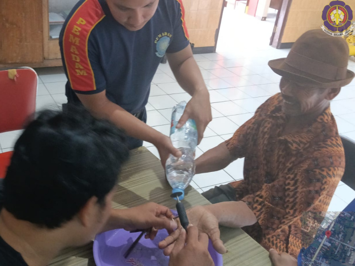 Melihat kondisi jari korban yang sudah mulai bengkak (luka ringan), petugas dari Bidang Pencegahan Kebakaran segera mengambil tindakan cepat. Dengan penuh ketelitian, petugas menggunakan alat gerinda mini untuk memotong cincin tersebut.