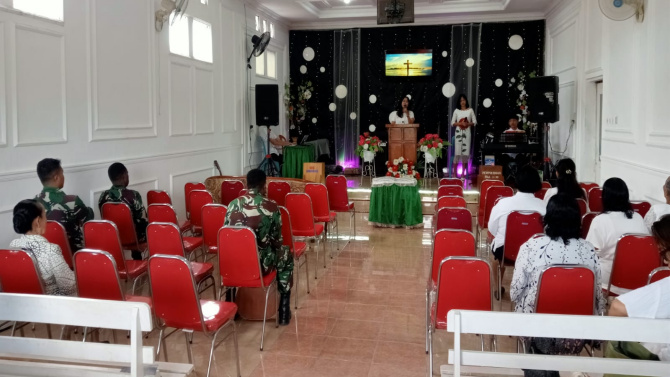 Ibadah yang berlangsung khidmat tersebut dipimpin oleh Pendeta Yernia Dwi Puryanto. Kehadiran para prajurit berseragam loreng di tengah jemaat memberikan warna tersendiri. Suasana gereja tampak penuh kehangatan saat para personel TNI duduk berdampingan dengan masyarakat setempat.