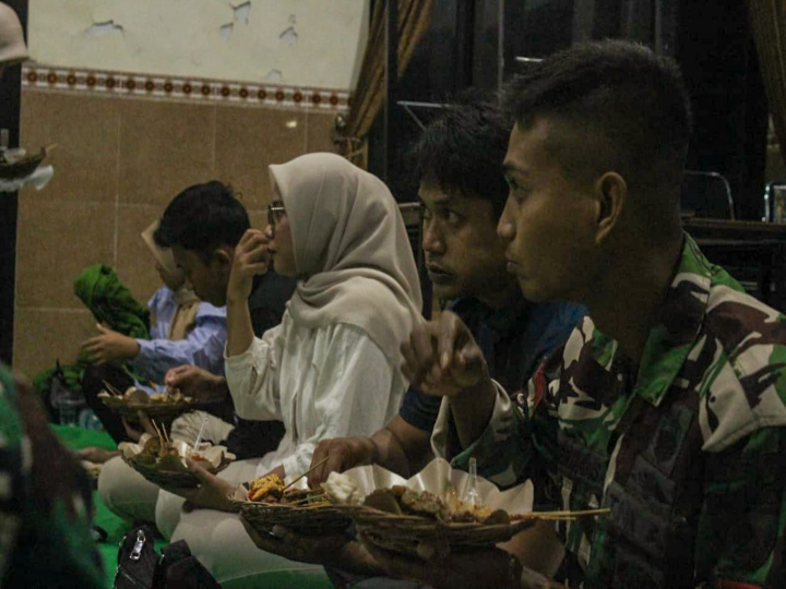 Menjelang azan Maghrib berkumandang, para prajurit TNI dan warga tampak asyik bercengkerama. Tidak ada sekat antara seragam loreng dan pakaian sipil; semuanya melebur dalam obrolan santai yang penuh tawa.